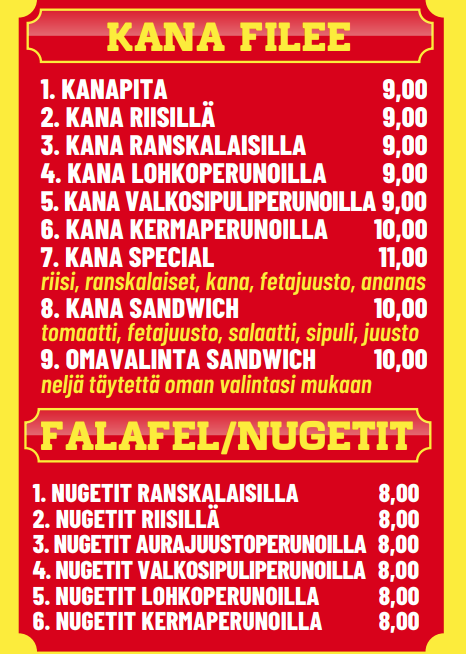 Etusivu   Pizzat   Calzonet   Kebabit   Rullat   Kana-ateriat & Nuggetit   Burger-ateriat   Lasten ateriat   Salaatit   Falafelit & K�fte   Paninit   Muut
