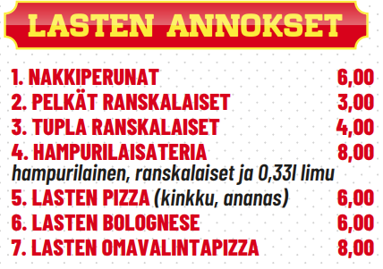 Etusivu   Pizzat   Calzonet   Kebabit   Rullat   Kana-ateriat & Nuggetit   Burger-ateriat   Lasten ateriat   Salaatit   Falafelit & K�fte   Paninit   Muut