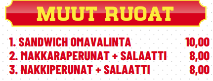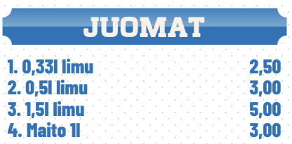 Etusivu   Pizzat   Calzonet   Kebabit   Rullat   Kana-ateriat & Nuggetit   Burger-ateriat   Lasten ateriat   Salaatit   Falafelit & K�fte   Paninit   Muut