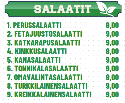 Etusivu   Pizzat   Calzonet   Kebabit   Rullat   Kana-ateriat & Nuggetit   Burger-ateriat   Lasten ateriat   Salaatit   Falafelit & K�fte   Paninit   Muut